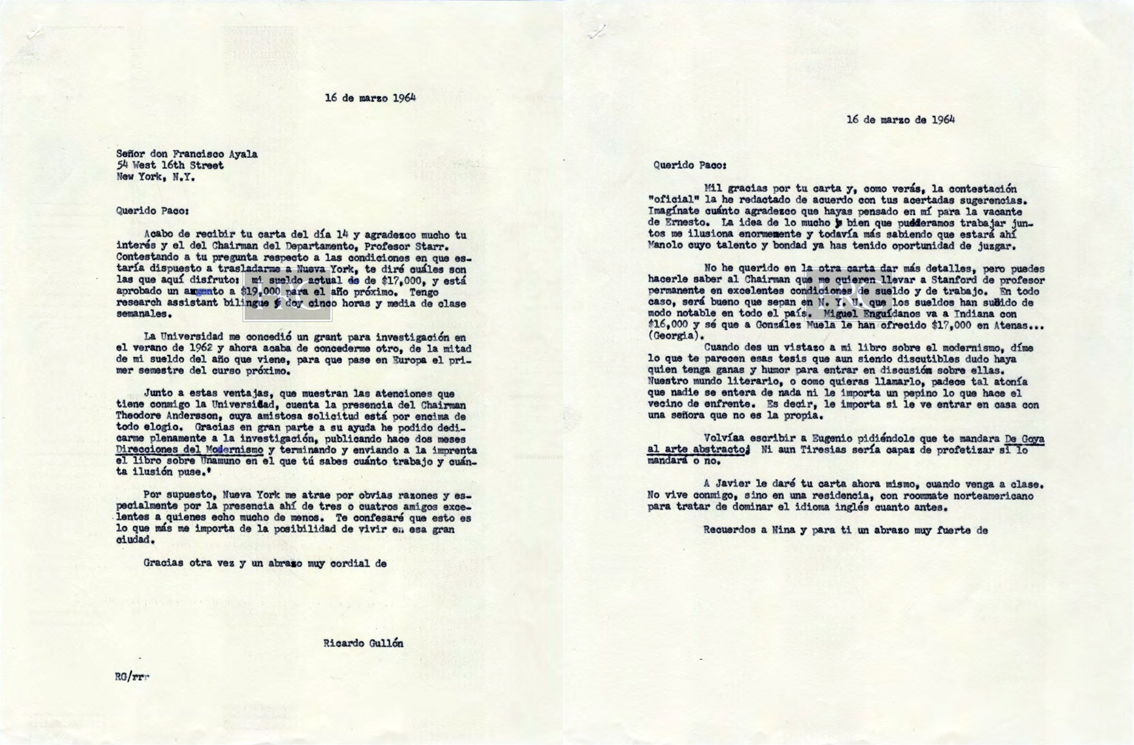 Acabo de recibir tu carta del día 14 y agradezco mucho tu interés y el del Chairman del Departamento, Profesor Starr. Contestando a tu pregunta respecto a las condiciones en que estaría dispuesto a trasladarme a Nueva York, te diré cuáles son las que aquí disfruto: mi sueldo actual es de $17,000, y está aprobado un aumento a $19,000 para el año próximo. Tengo research assistant bilingue y doy cinco horas y media de clase semanales.