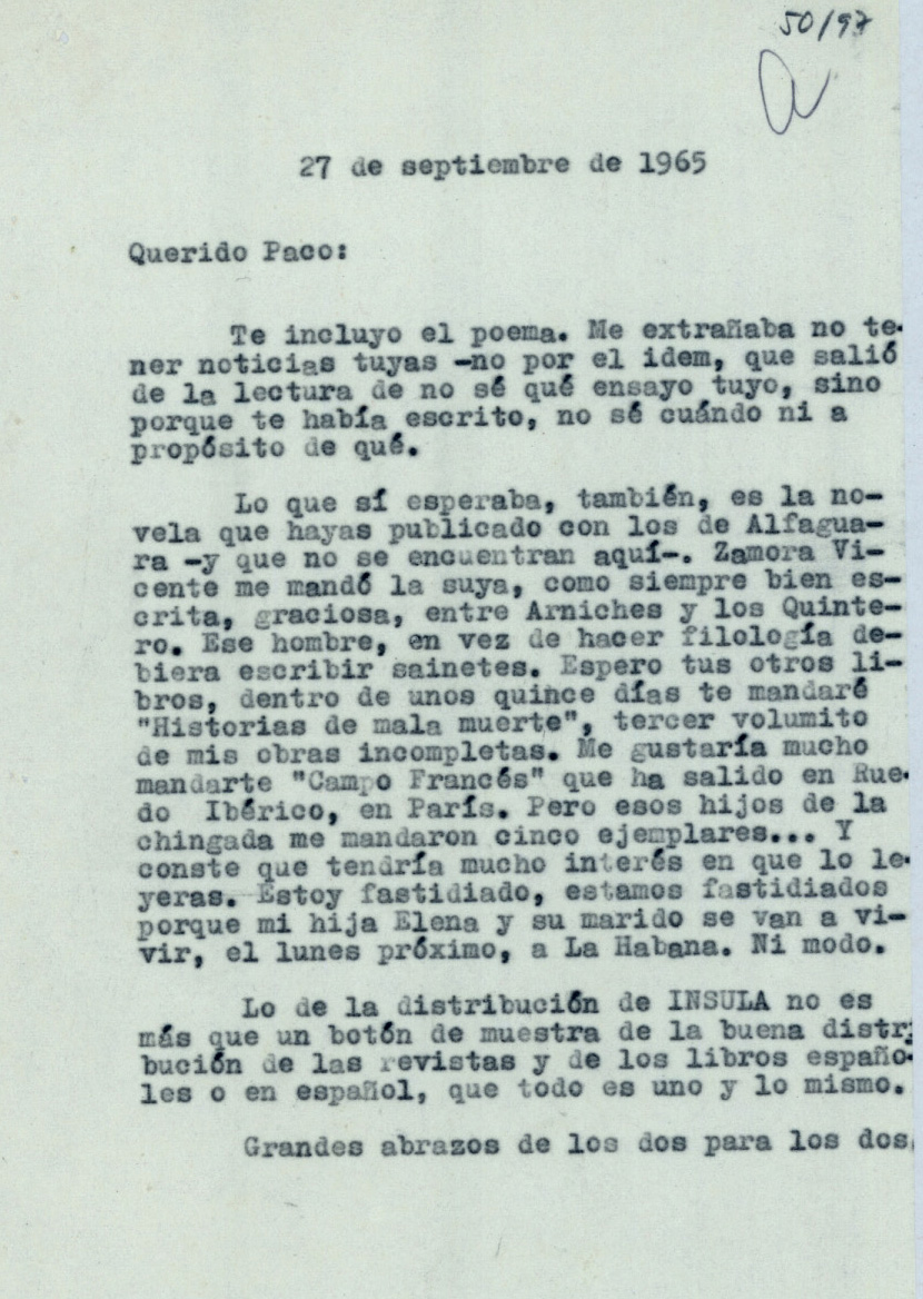 Lo que sí esperaba, también, es la novela que hayas publicado con los de Alfaguara –y que no se encuentran aquí–. Zamora Vicente me mandó la suya, como siempre bien escrita, graciosa, entre Arniches y los Quintero. Ese hombre, en vez de hacer filología debiera escribir sainetes. Espeto tus otros libros, dentro de unos quince días te mandaré Historias de mala muerte, tercer volumito de mis obras incompletas. Me gustaría mucho mandarte Campo Francés que ha salido en Ruedo Ibérico, en París. Pero esos hijos de la chingada me mandaron cinco ejemplares… Y conste que tendría mucho interés en que lo leyera. Estoy fastidiado, estamos fastidiados porque mi hija Elena y su marido se van a vivir, el lunes próximo, a La Habana. Ni modo.