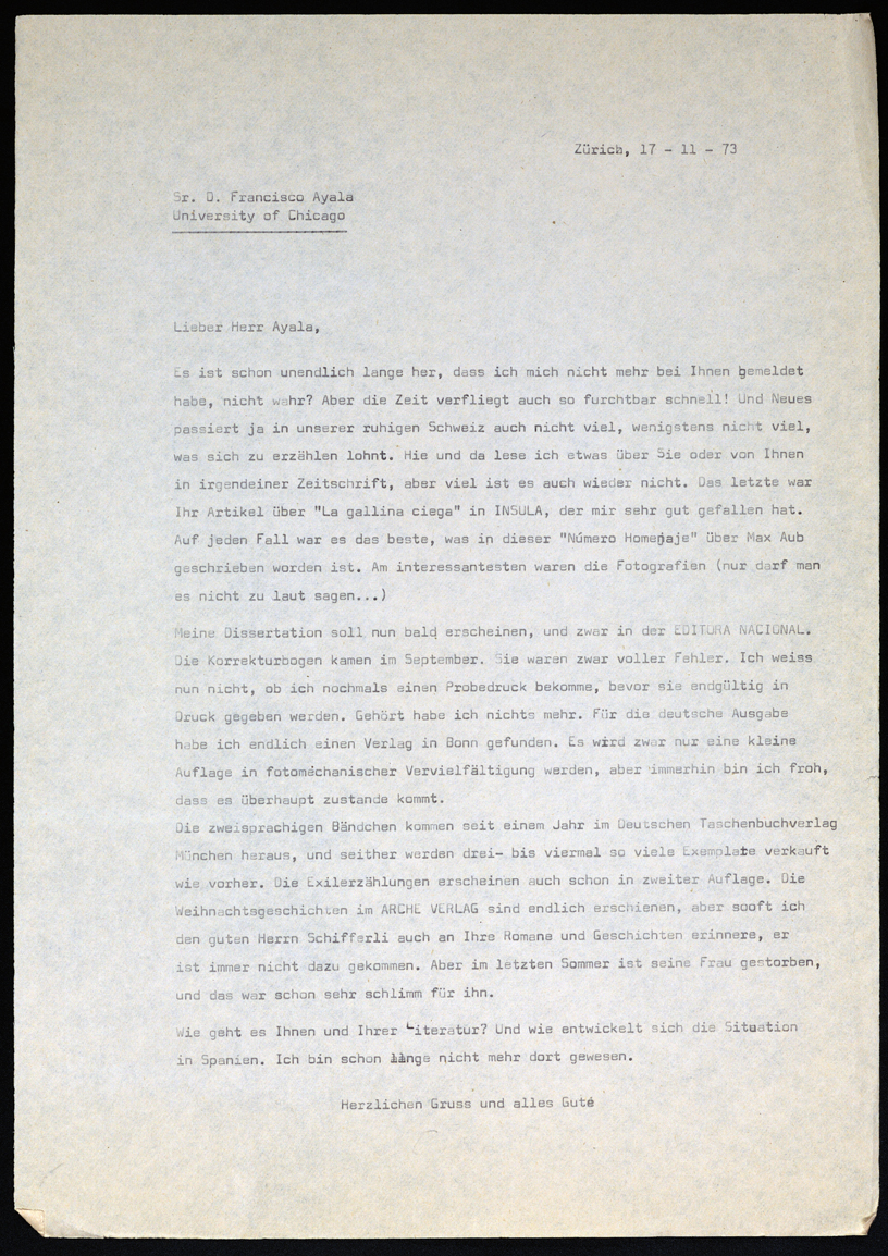 Carta de Gonzalo Sobejano a Francisco Ayala (16/11/1972)