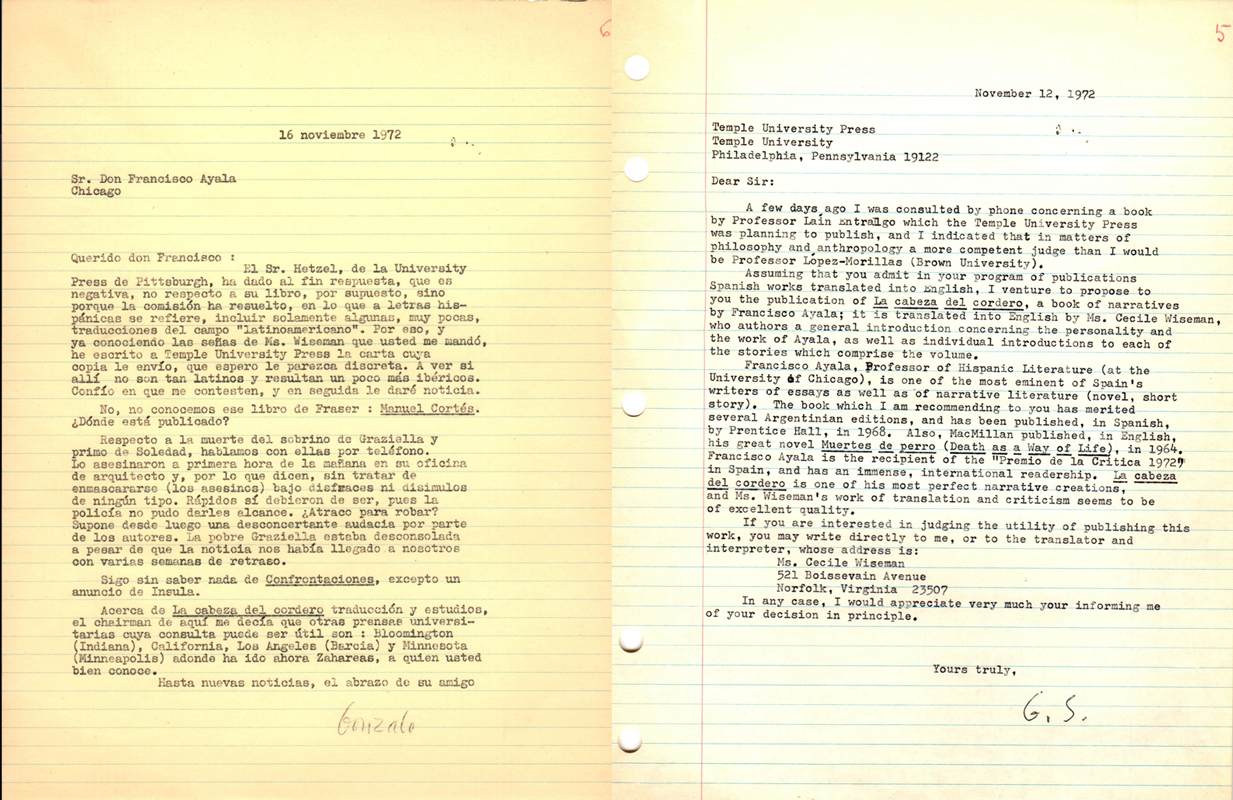 Assuming that you admit in your program of publications Spanish works translated into English, I venture to propose to you the publication of La cabeza del cordero, a book of narratives by Francisco Ayala; it is translated into English by Ms. Cecile Wiseman, who authors a general introduction concerning the personality and the work of Ayala, as well as individual introductions to each of the stories which comprise the volume.