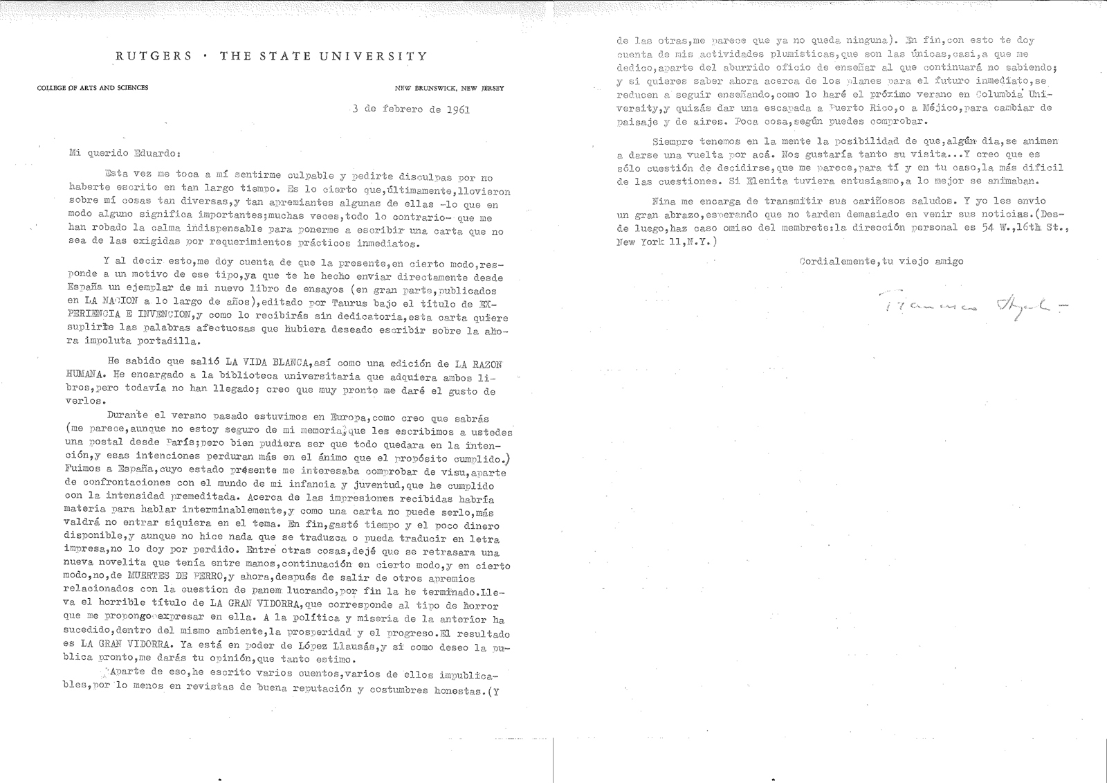 Carta de Francisco Ayala a Ricardo Gullón (17/01/1961)
