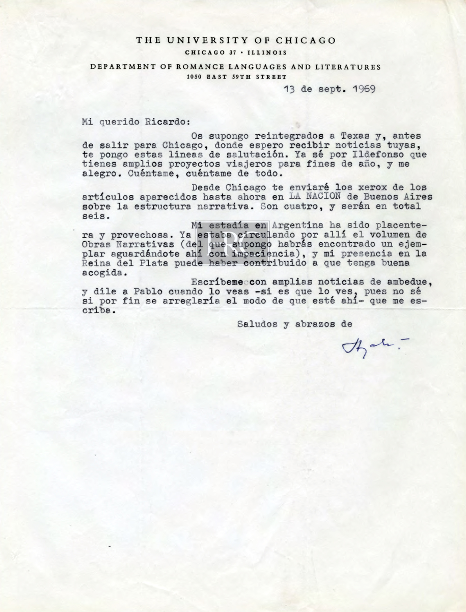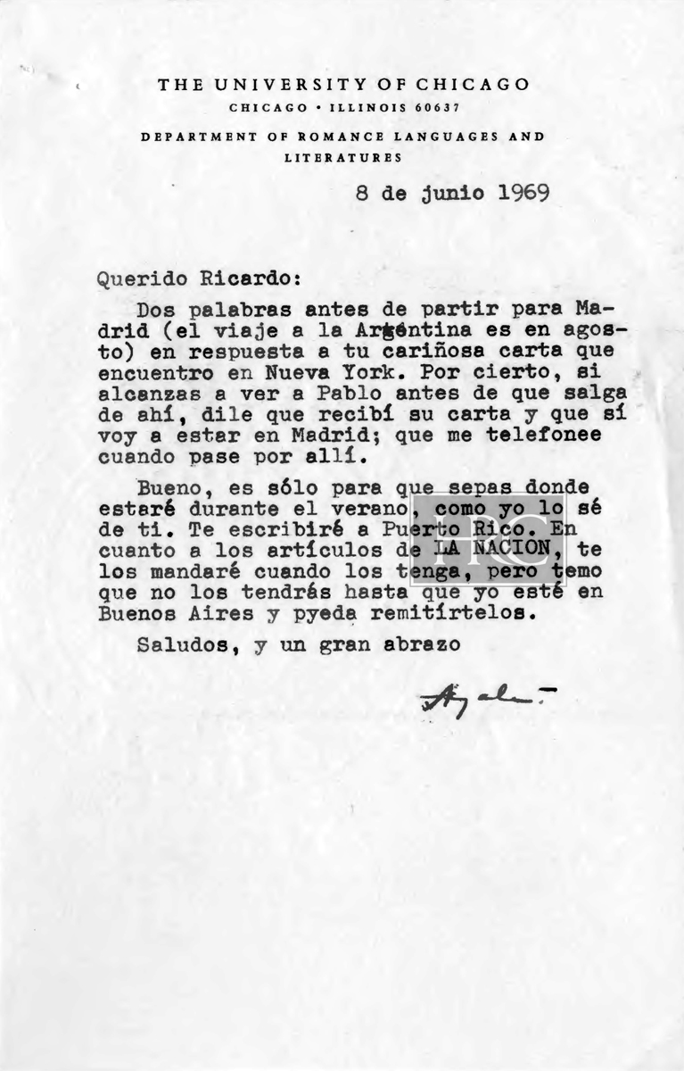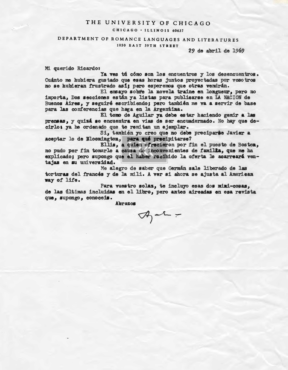 [Carta mecanografiada con firma autógrafa y con membrete:] THE UNIVERSITY OF CHICAGO / CHICAGO. ILLINOIS 60637 / DEPARTMENT OF ROMANCE LANGUAGES AND LITERATURES / 1050 EAST 59TH STREET
