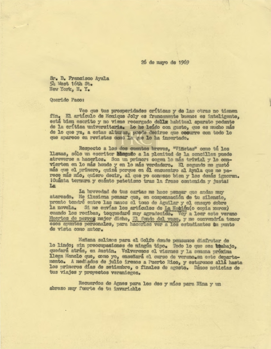 Carta de Ricardo Gullón a Francisco Ayala (26/05/1969)