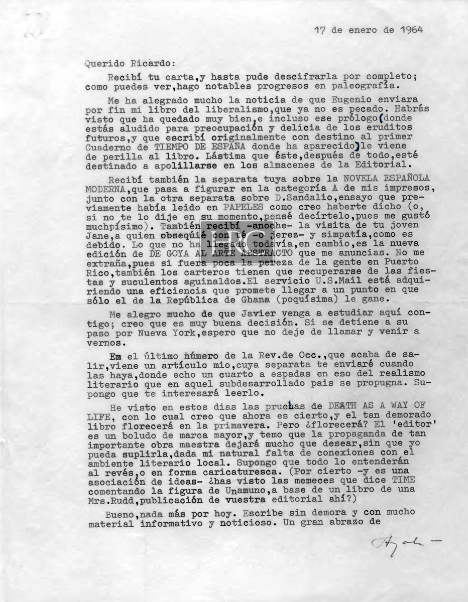 Carta de Francisco Ayala a Ricardo Gullón (17/01/1964)