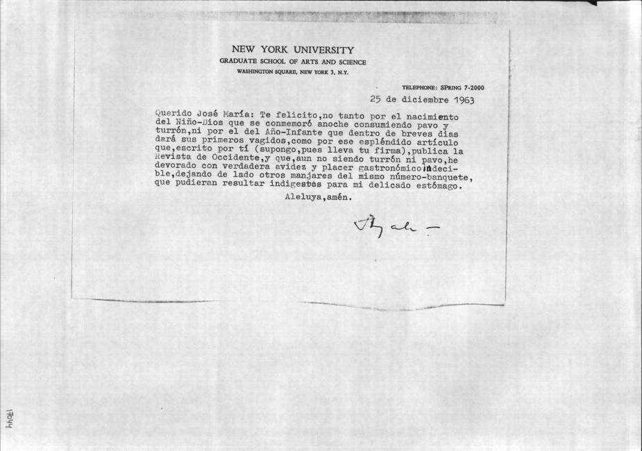 Querido José María: Te felicito, no tanto por el nacimiento del Niño-Dios que se conmemoró anoche consumiendo pavo y turrón, ni por el del Año-Infante que dentro de breves dias dará sus primero vagidos, como por ese espléndido artículo que, escrito por tí (supongo, pues lleva tu firma), publica la Revista de Occidente, y que, aun no siendo turrón ni pavo, he devorado con verdadera avidez y placer gastronómico indecible, dejando de lado otros manjares del mismo número-banquete, que pudieran resultar indigestos para mi delicado estómago.