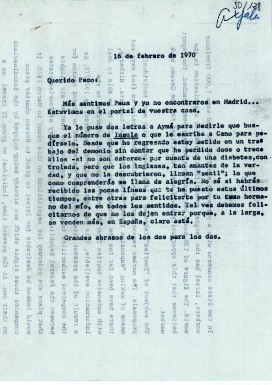 Carta de Max Aub a Francisco Ayala (16/02/1970)