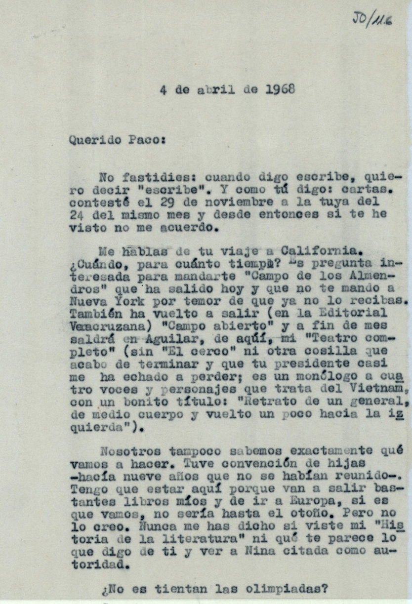Nada más te digo. He recibido el estudio preliminar que el joven Andrés Amorós ha escrito para la edición Aguilar de mis Obras narrativas completas (¿qué te parece ese título?, porque Novelas no sería exacto, desde que entran hasta sketches de unas pocas lineas), y después de una ojeada de la que saco excelente impresión, me voy a casa para leerlo despacio.