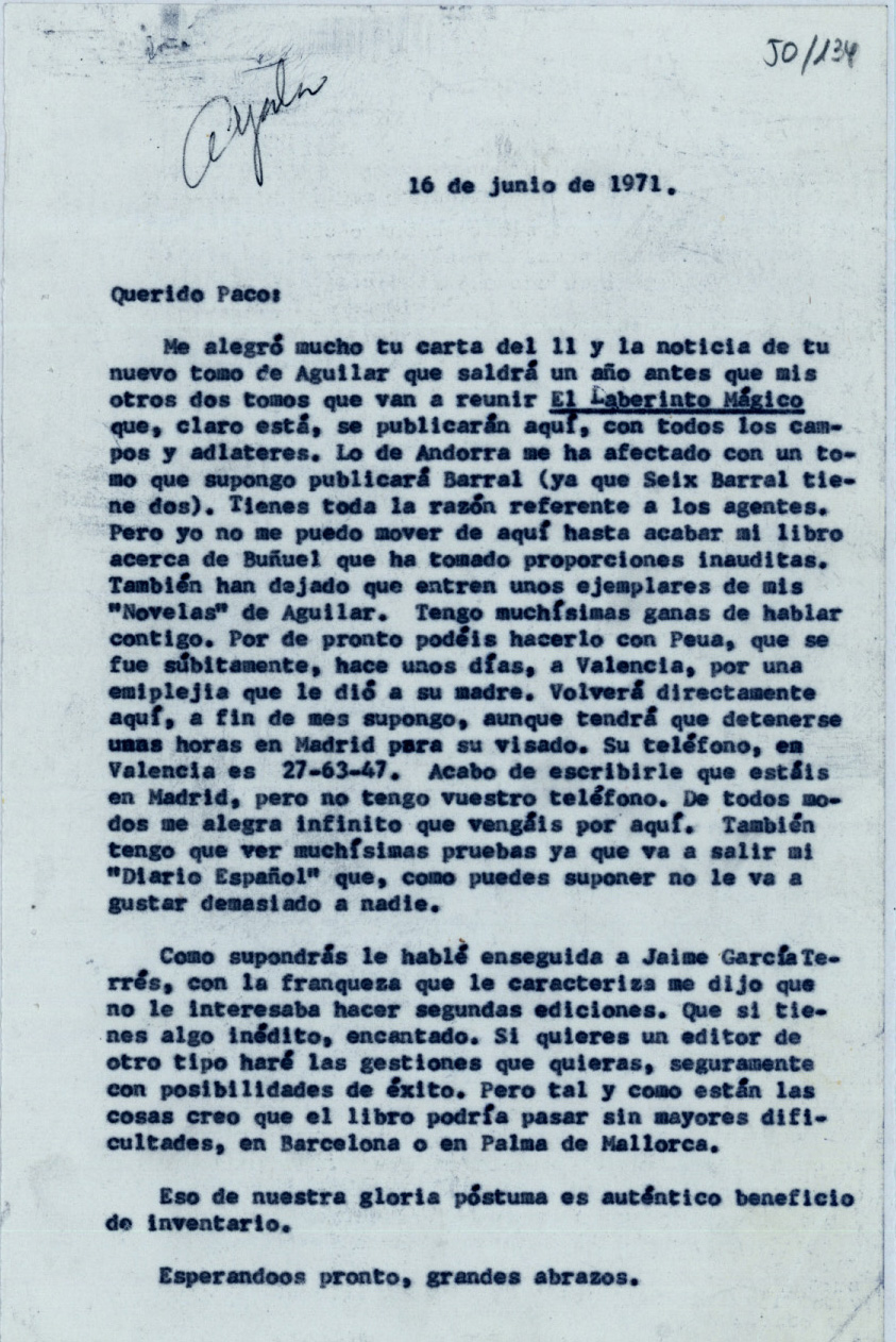 Me alegró mucho tu carta del 11 y la noticia de tu nuevo tomo de Aguilar que saldrá un año antes que mis otros dos tomos que van a reunir El Laberinto Mágico que, claro está, se publicarán aquí, con todos los campos y adláteres. Lo de Andorra me ha afectado con un tomo que supongo publicará Barral (ya que Seix Barral tiene dos). Tienes toda la razón referente a los agentes. Pero yo no me puedo mover de aquí hasta acabar mi libro acerca de Buñuel que ha tomado proporciones inauditas. También han dejado que entren unos ejemplares de mis Novelas de Aguilar. Tengo muchísimas ganas de hablar contigo. Por de pronto podéis hacerlo con Peua, que se fue súbitamente, hace unos días, a Valencia, por una emiplejia [sic] que le dió a su madre. Volverá directamente aquí, a fin de mes supongo, aunque tendrá que detenerse unas horas en Madrid para su visado. Su teléfono, en Valencia es 27-63-47. Acabo de escribirle que estáis en Madrid, pero no tengo vuestro teléfono. De todos modos me alegra infinito que vengáis por aquí. También tengo que ver muchísimas pruebas ya que va a salir mi Diario Español que, como puedes suponer no le va a gustar demasiado a nadie.