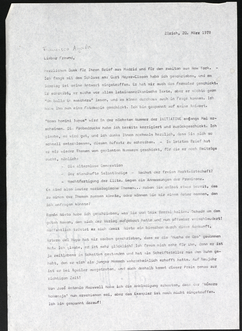 He llegado a Madrid en estos dias y, como le prometí, le he preparado un original del tamaño deseado, de modo que puedan ustedes publicar uno [sic] volumen mio. Verá que, según le anuncié oportunamente, en lugar de formar una colección heterogénea de ensayos con el de Quevedo que usted conoce, he compuesto un libro con cierta unidad, aprovechando que Aguilar sacará un segundo tomo de mis Obras completas en su Biblioteca de Autores modernos, donde se reunen mis escritos de teoría y crítica literaria. De él he entresacado esos tres estudios, que constituyen en verdad un libro homogeneo. Se los envio en sobre aparte.