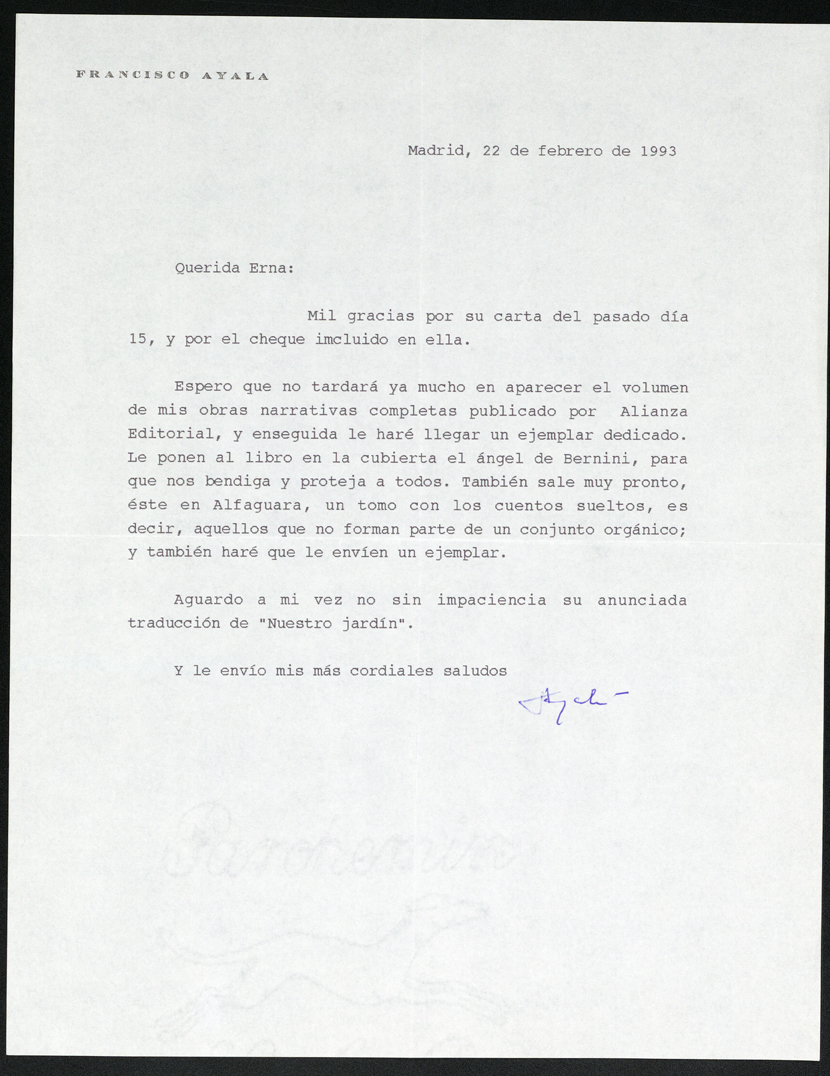 Aunque seguramente lo habrá recibido Vd. por conducto de “Andorra”, prefiero que tenga duplicado y por ello le envío el excelente desplegado de Primera Página, de Alicante, “Aproximación a Francisco Ayala, en que, sobre la base de Los usurpadores, se refieren a las novelas publicada por “Alianza”, en “El Libro de Bolsillo”, y a la de “Alfaguara”. Asimismo, la nota de Ortiz Alfau en Hierro, de Bilbao, y el comentario de Miguel Angel Pastor en El Norte de Castilla, de Valladolid.