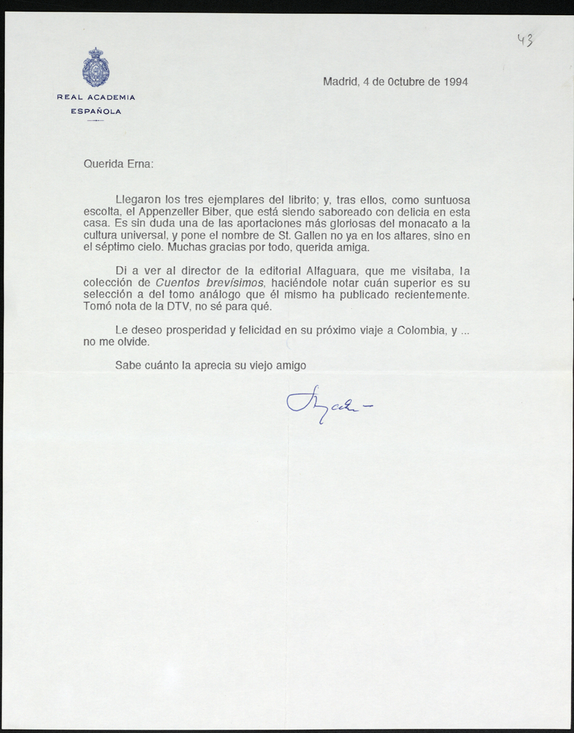 No sabe Vd. cómo le agradezco –y valoro– su opinión sobre Vísperas. Es una generosidad amistosa haberlo leído y que esas novelas le interesen. También cuando esté en Madrid, me agradará conocer en detalle, y con sus instructivas observaciones técnicas, su opinión. El que merezca su consideración, y bien sabe que no incurro en cortesía retórica, significa para mí uno de los más importantes alientos.