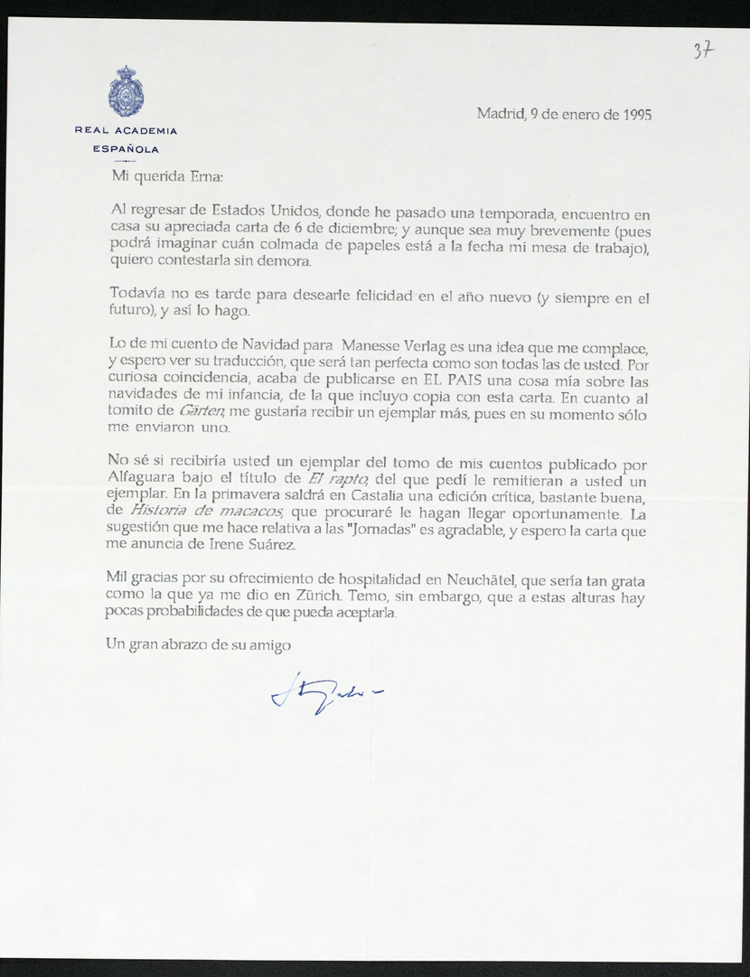 Lo de mi cuento de Navidad para Manesse Verlag es una idea que me complace, y espero ver su traducción, que será tan perfecta como son todas las de usted. Por curiosa coincidencia, acaba de publicarse en El País una cosa mía sobre las navidades de mi infancia, de la que incluyo copia con esta carta. En cuanto al tomito de Gärten, me gustaría recibir un ejemplar más, pues en su momento solo me enviaron uno.