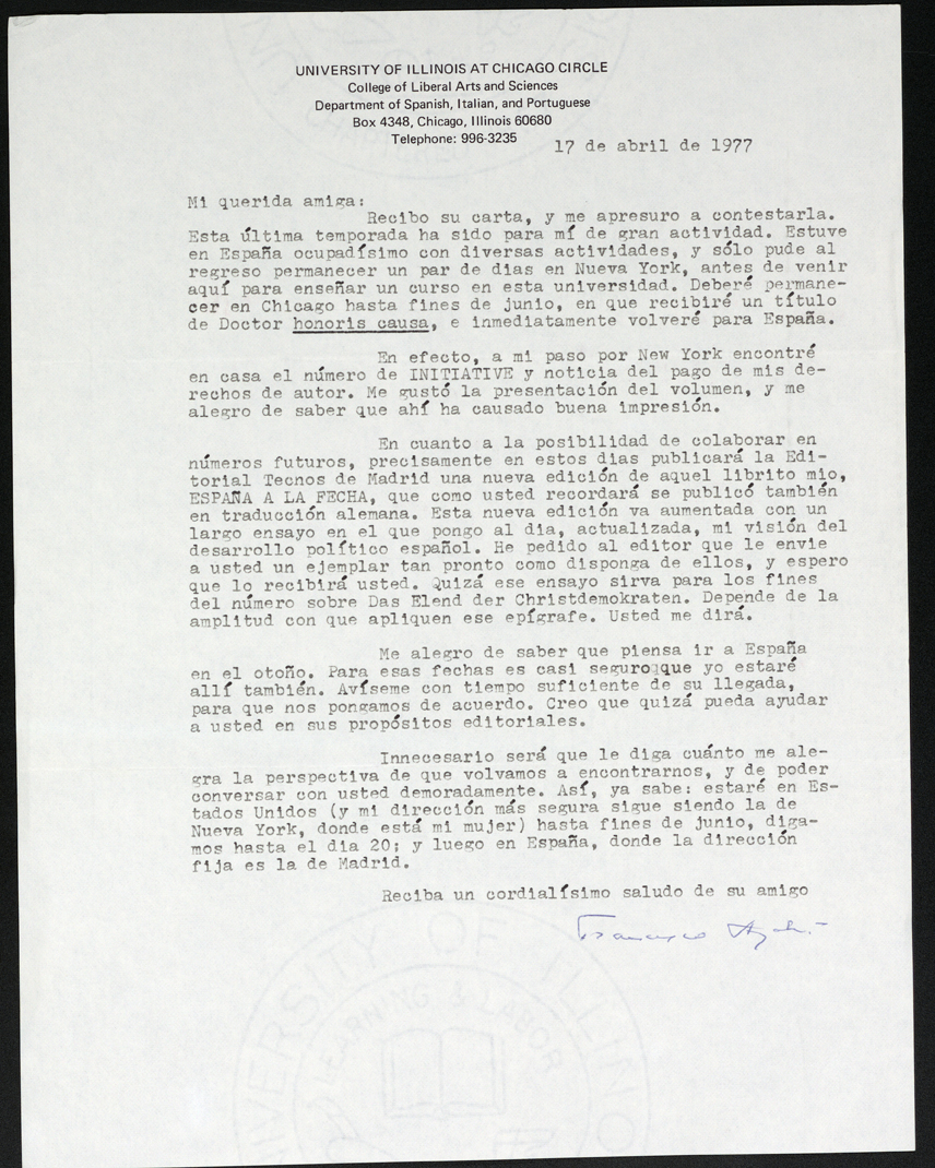 Carta de Francisco Ayala a Erna Brandenberger (17/04/1977)