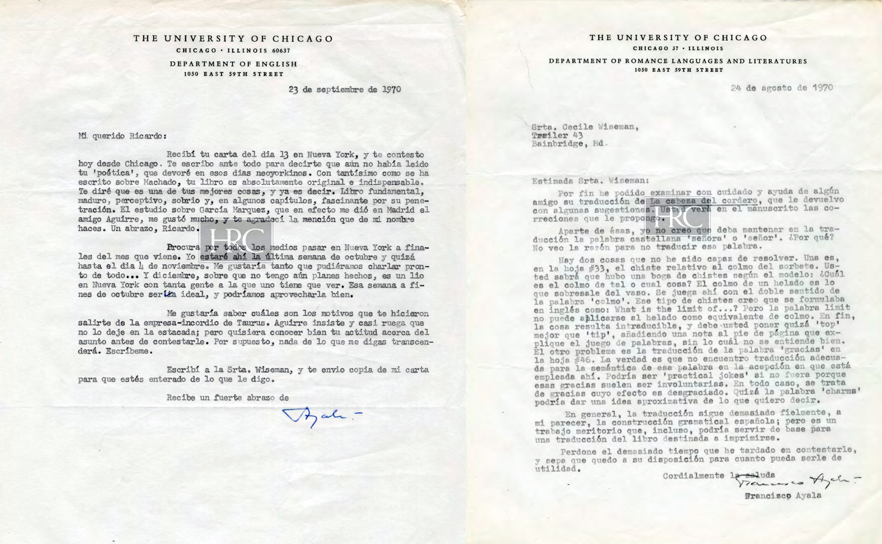 [Carta mecanografiada con firma autógrafa y membrete:] THE UNIVERSITY OF CHICAGO / CHICAGO. ILLINOIS 60637 / DEPARTMENT OF ENGLISH / 1050 EAST 59TH STREET [Copia de carta adjunta mecanografiada con firma autógrafa y membrete:] THE UNIVERSITY OF CHICAGO / CHICAGO 37. ILLINOIS / DEPARTMENT OF ROMANCE LANGUAGES AND LITERATURES / 1050 EAST 59TH STREET
