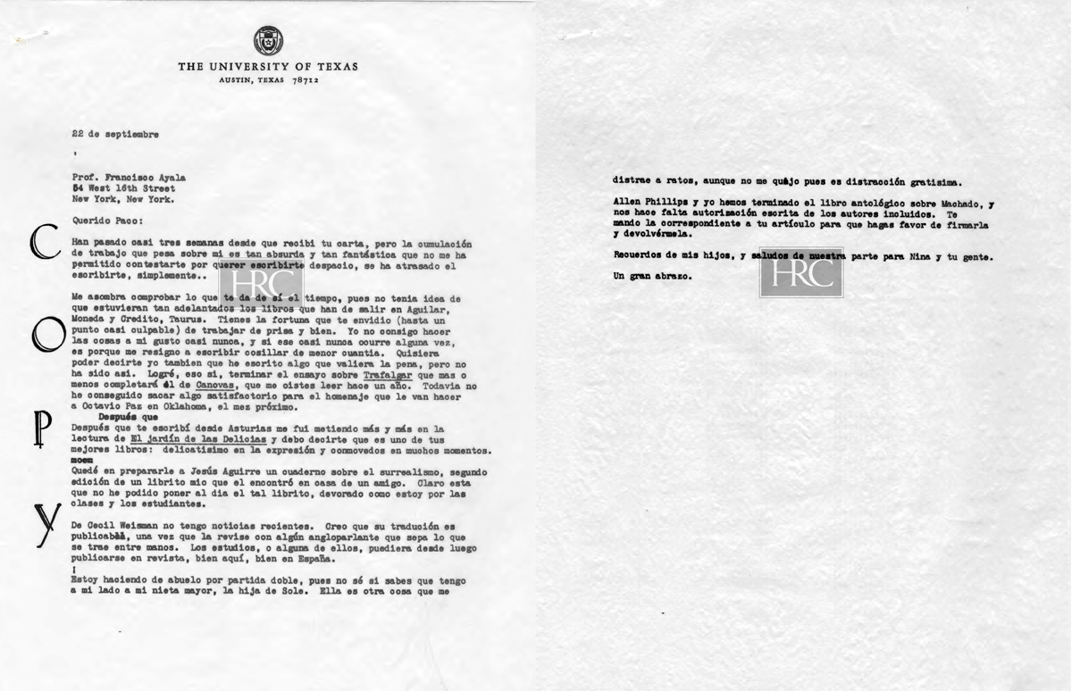 Carta de Francisco Ayala a Ricardo Gullón (23/09/1970)