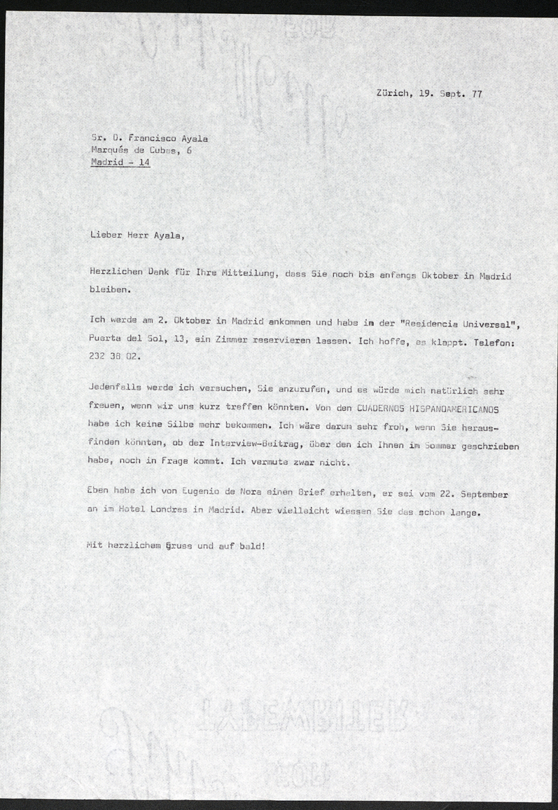 2. Francisco García Pavón habe ich ein spanisches Manuskript schicken lassen. Er hat sich anerboten, die Autorenportraits durchzulesen und mir allfällige kritische Bemerkungen über einzelne Autoren zu nennen. Denn ich weiss ja nicht, wie verletzlich die Leute vielleicht sind. Und ich will ihnen ja nicht schaden. Seither hat er keinen Ton mehr von sich hören lassen. Er soll mir doch das Manuskript schicken, gelesen oder ungelesen.