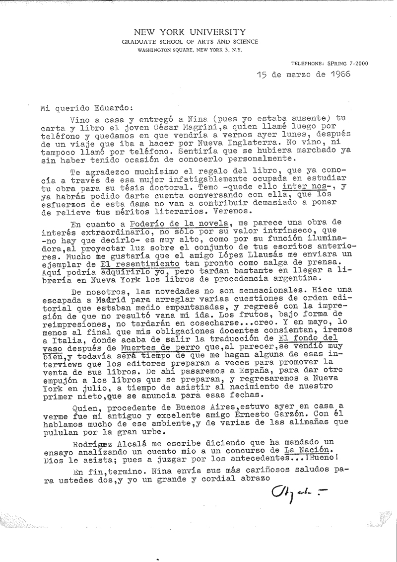 En cuanto a Poderío de la novela, me parece una obra de interés extraordinario, no sólo por su valor intrínseco, que –no hay que decirlo– es muy alto, como por su función iluminadora, al proyectar luz sobre el conjunto de tus escritos anteriores. Mucho me gustaría que el amigo López Llausás me enviara un ejemplar de El resentimiento tan pronto como salga de prensa. Aquí podría adquirirlo yo, pero tardan bastante en llegar a librería en Nueva York los libros de procedencia argentina.