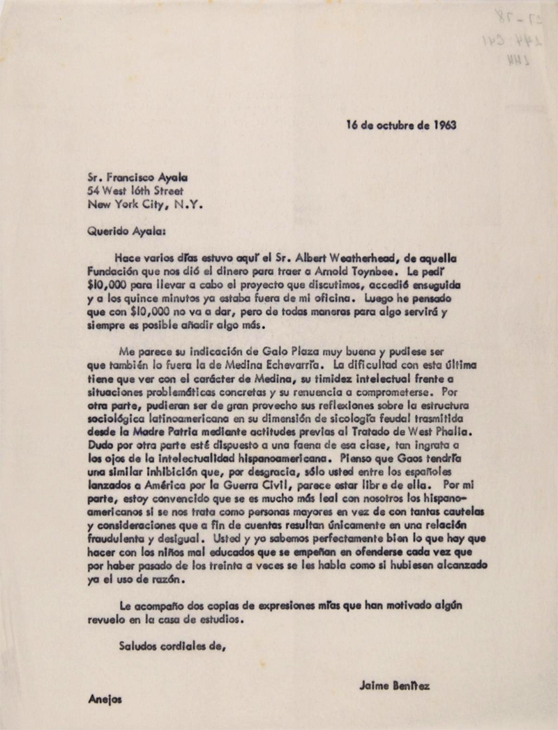 Carta de Jaime Benítez a Francisco Ayala (16/10/1963)